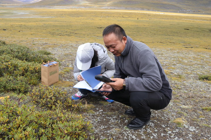 “生态先锋队”郝伟(右)和团队工作人员在野外采集植物样本数据。受访者供图