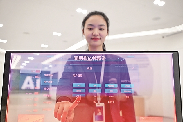 天津一家科技公司内,工作人员演示多语种AI透明屏实时翻译系统。新华社发