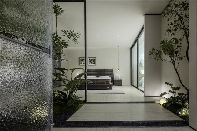 “承”幕中,空间与品牌开始相互构建。从产品展示区到品牌历史长廊,再到核心科技区,参观者在动线推进中逐渐触摸到雅兰的品牌脉络。顶部线条引导光线流动,矮墙与绿植隔而不断,自然韵律唤醒人们对智慧生活的具体想象。雅兰智能床的五大云感科技与八大睡眠模式,并非孤立的技术参数,而是被嵌入到空间叙事里,成为支撑生活质感的细节。